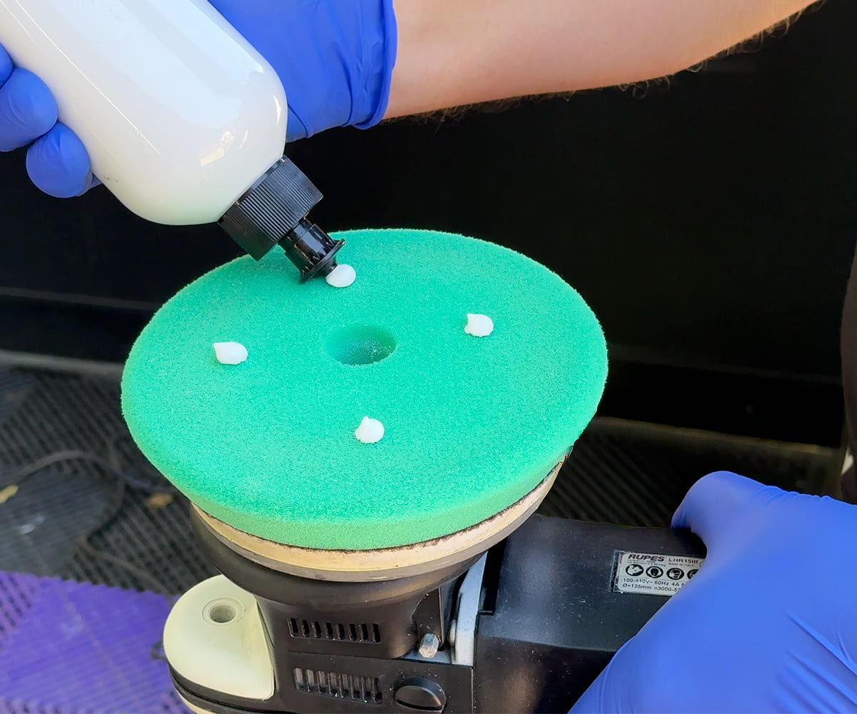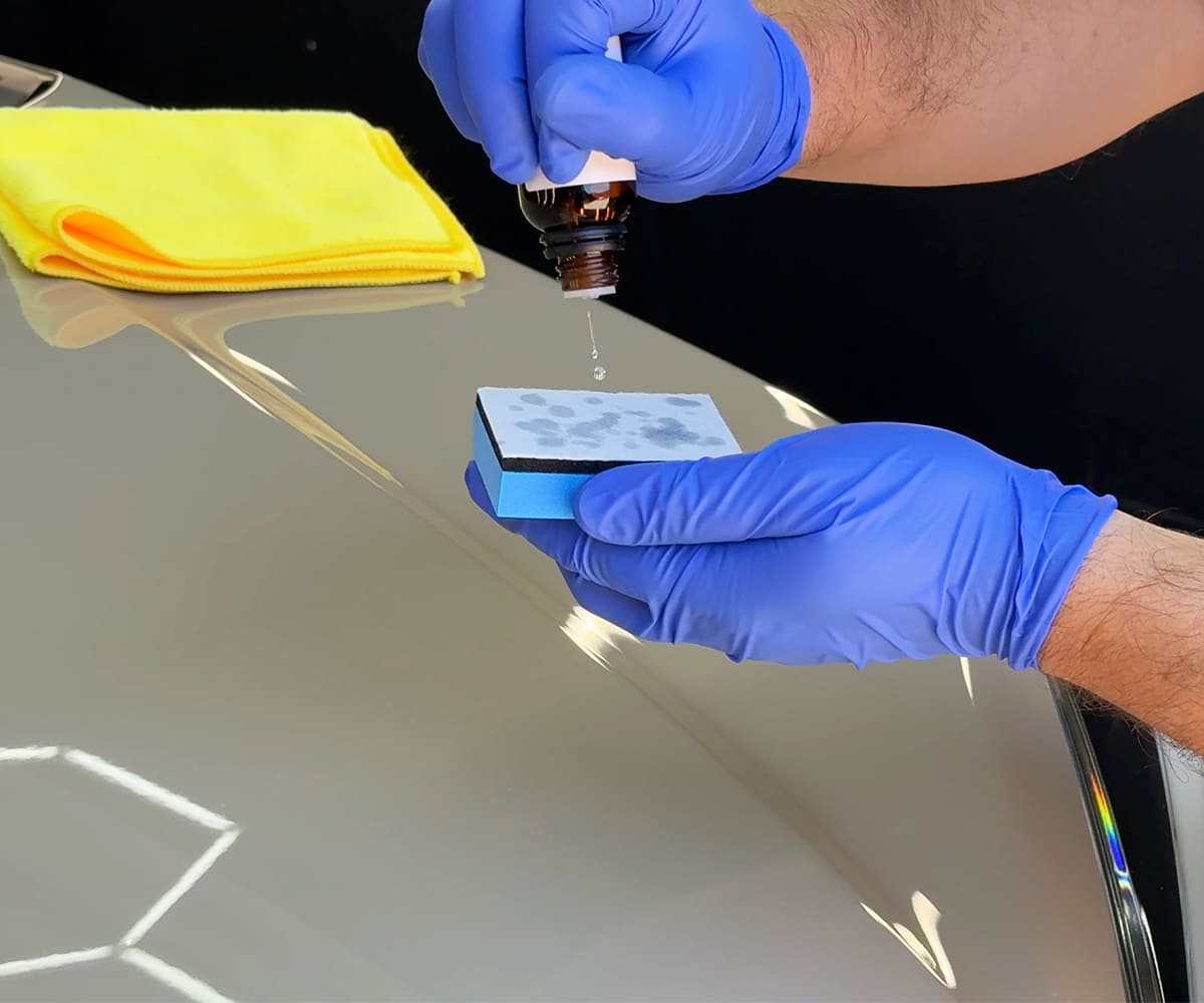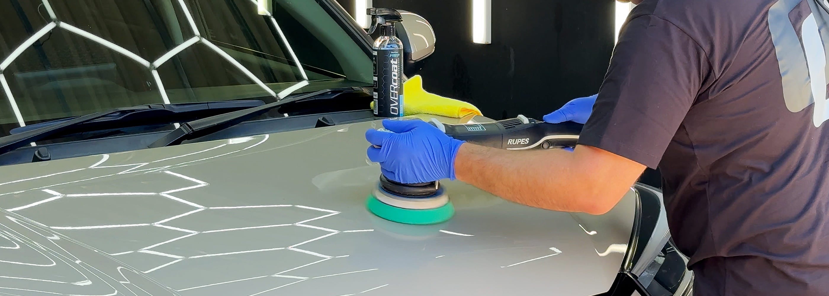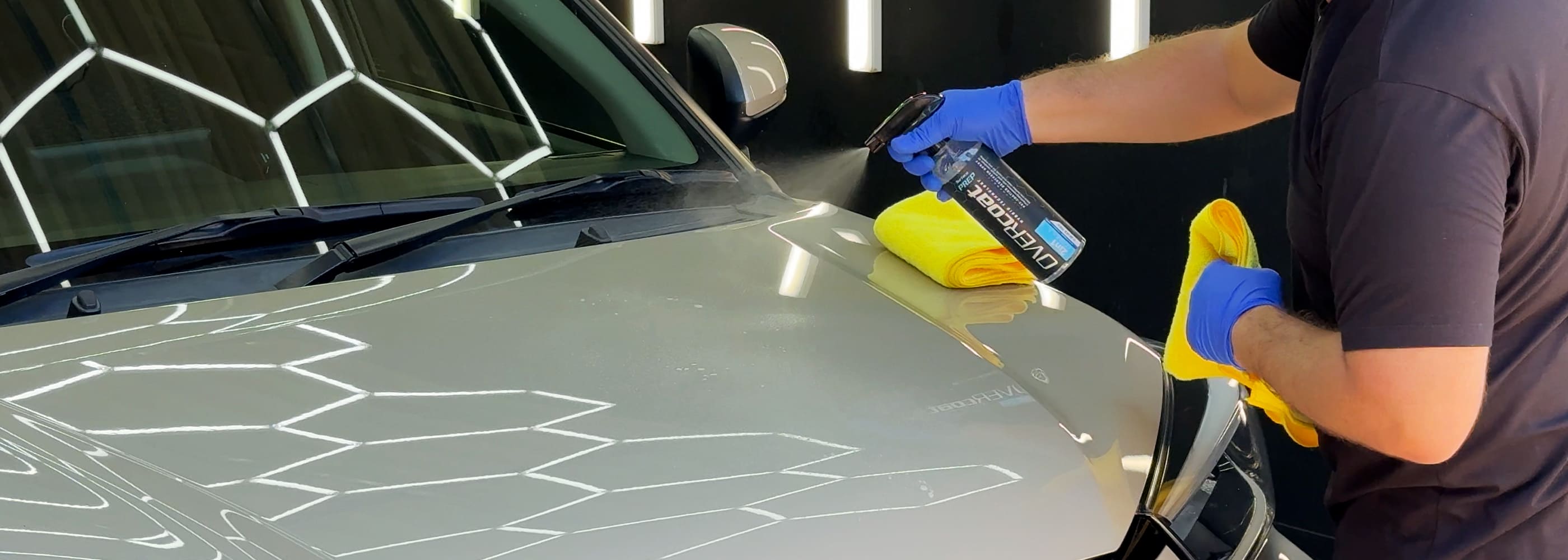 Before application, ensure the surface is cool. During hand or machine polishing, remove excess compound with a clean cloth, then spray Surface PREP onto the panel or a microfiber towel and wipe evenly. This step makes it easier to check for holograms and fine polishing marks before coating.