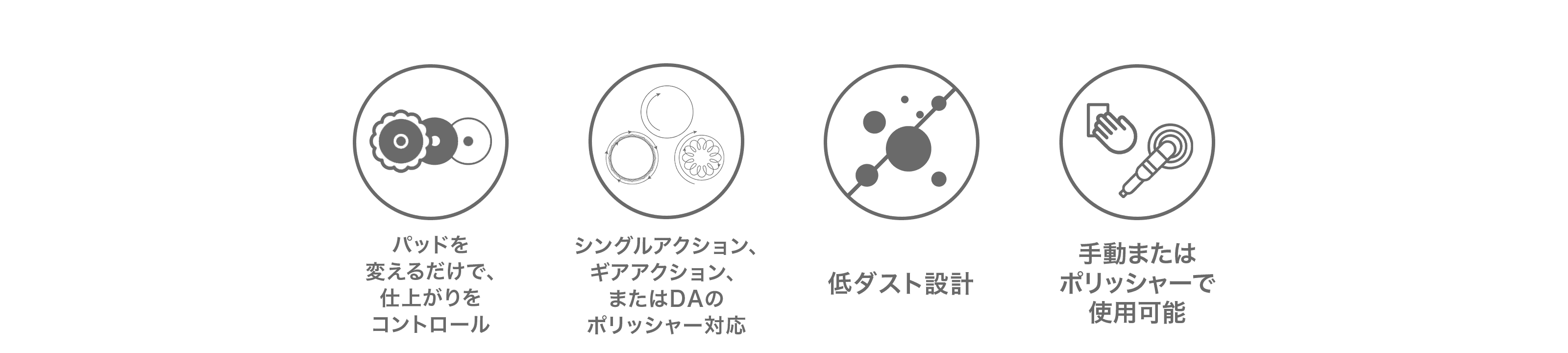 初期研磨〜中間研磨〜仕上げをパッド選択でコントロール。低粉塵・軽い拭き取りで作業効率も高めます。